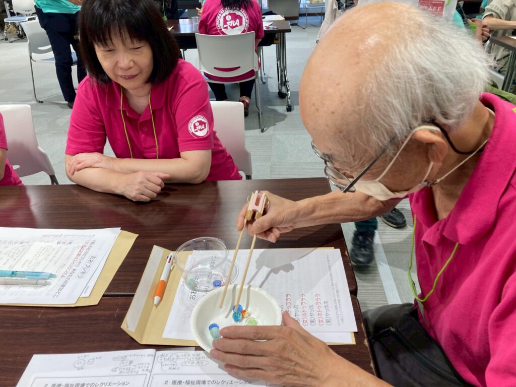 第1部はケアレクリエーション倶楽部会長の南部広司氏を迎え、福祉の現場で実践しているレク財の体験を行いました。ギター演奏による歌を唱いながら身体を動かす楽しさの体験や指先を使ったレク財等、現場にマッチさせる工夫が随所に施され、施設職員の参加者も思わずうなる、濃い研修ができました。